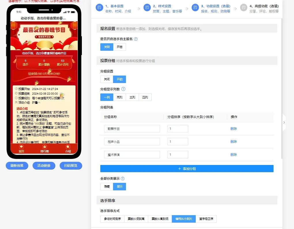 4.功能设置:设置投票分组(可添加歌舞节目、相声小品、魔术表演等不同组别),投票规则,还能开启防刷票功能。