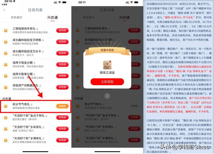 工银兴农通抽2-5元微信立减金,抽中微信立减金全国工行卡都可以抵扣。
