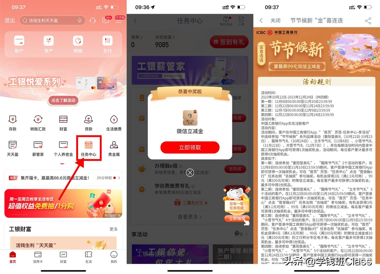 工商银行客户端,任务中心登陆融e行抽立减金,亲中3元立减金。