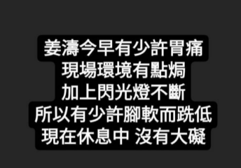 姜涛近期工作繁忙,14日凌晨一直忙到2点才收工,猜测是没有休息足够,才导致体力不支倒地。事后经纪人发文报平安:“姜涛今早有少许胃痛,现场环境有点闷,加上闪光灯不断,所以有少许脚软而跌倒。现在休息中没有大碍。大家不用担心,老姜答应我,这两日会好好休息。”