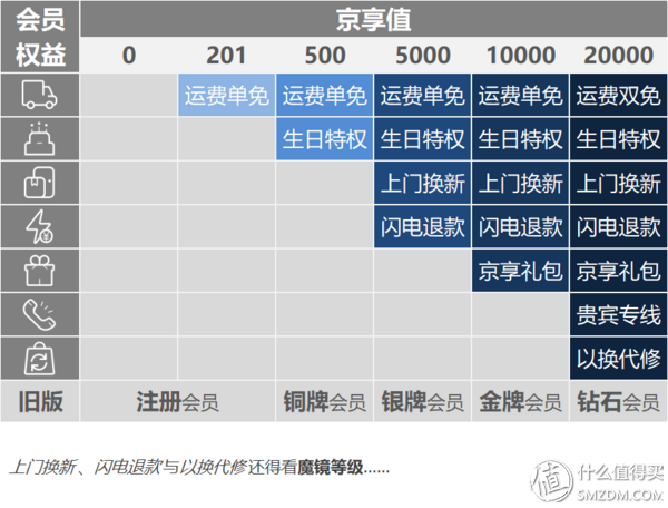 显然,魔镜体系并不成熟,因为前四种权益根本不分级,只有上门换新(以换代修)与闪电退款必须S2才能享受,然而S2到S6还是几乎不分级……好尴尬。魔镜等级最大的区别,就只是闪退额度差异而已,这里与京享值是强关联的,不知道你们晕没有。