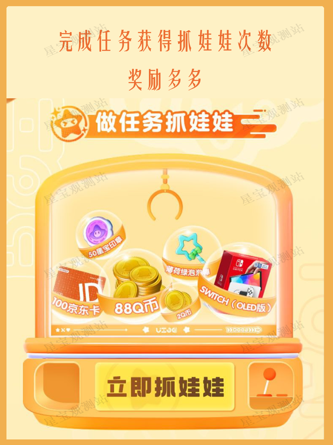 通过任务获取抓娃娃次数,有概率获取【SWITCH】、【88QB】、【100JD卡】等奖励。