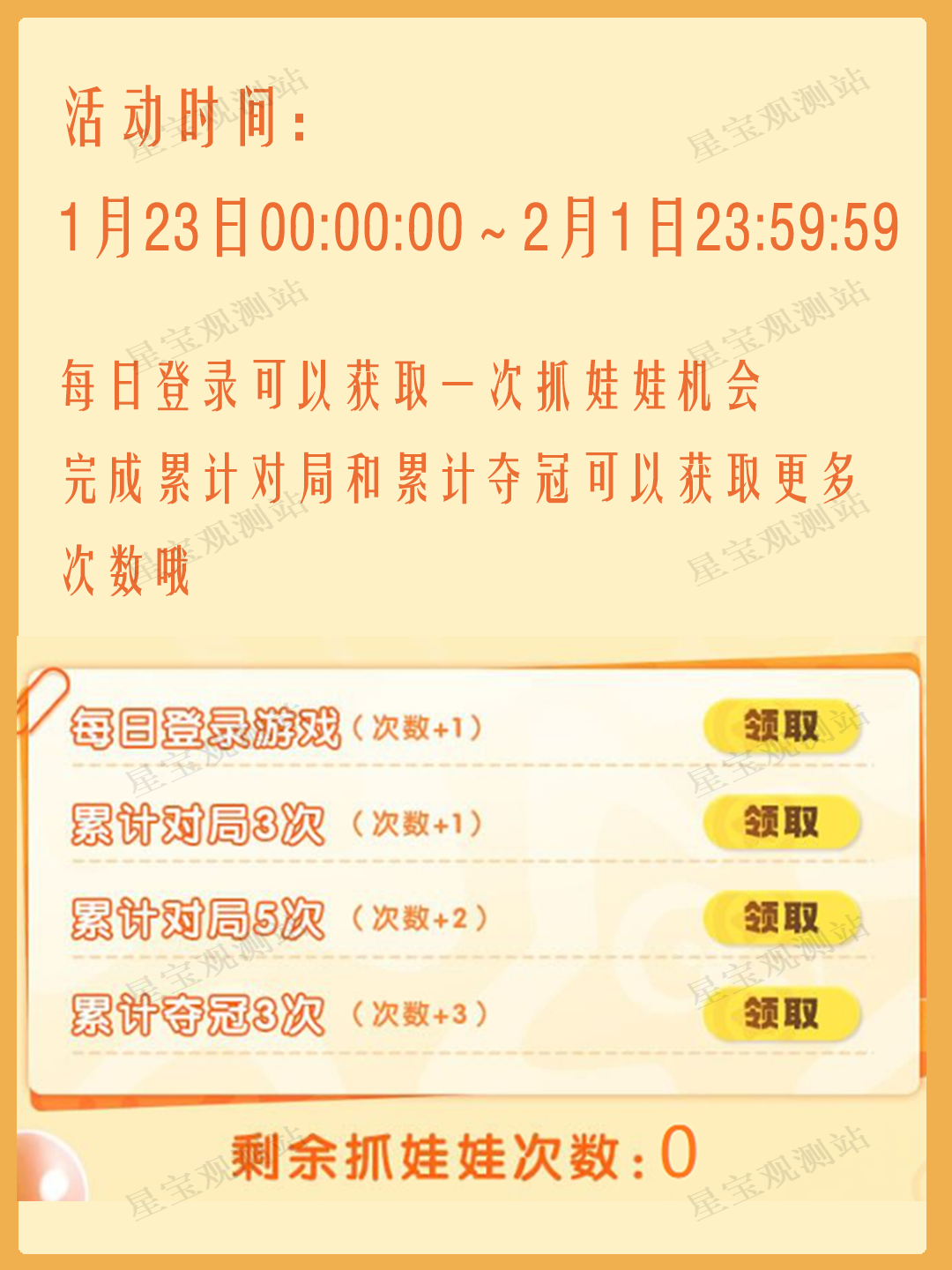 关注 星宝观测站,后台回复 抓娃娃 可以快速获取活动链接哦~(拿到链接后复制链接用浏览器打开)