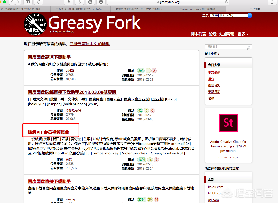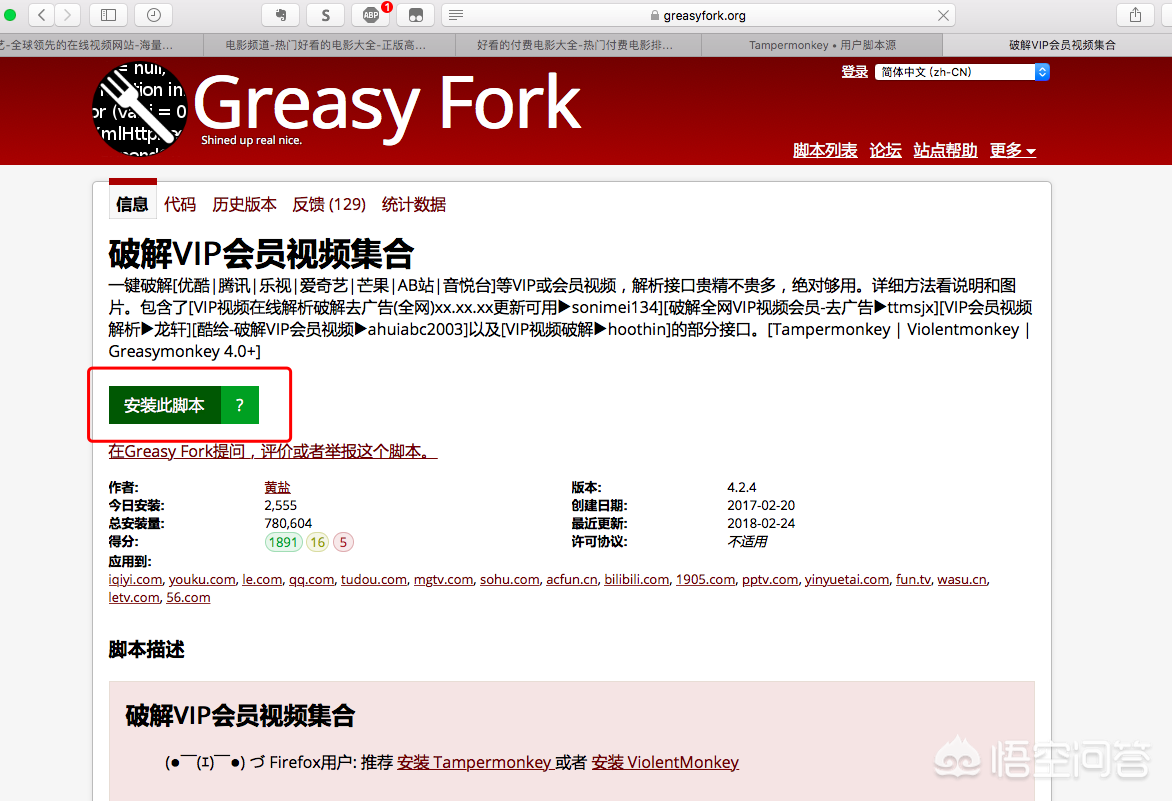 3.选择第一个脚本源,它的网站中,有很多优秀的脚本。而我们需要的破解VIP会员视频的脚本,就在首页靠上的位置。点击它,安装即可。