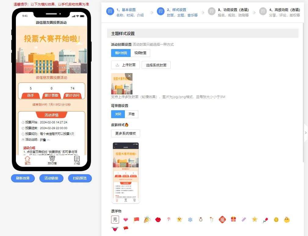 根据活动类型或风格,选择合适的活动封面,皮肤样式、漂浮物及背景音乐等等。