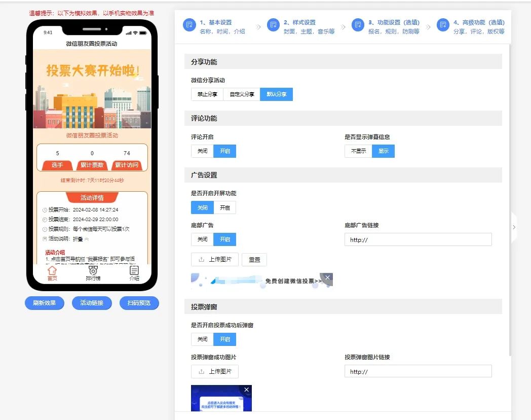 高级功能中包括了分享、评论、广告、投票弹窗等功能,大家可自行设置或跳过。