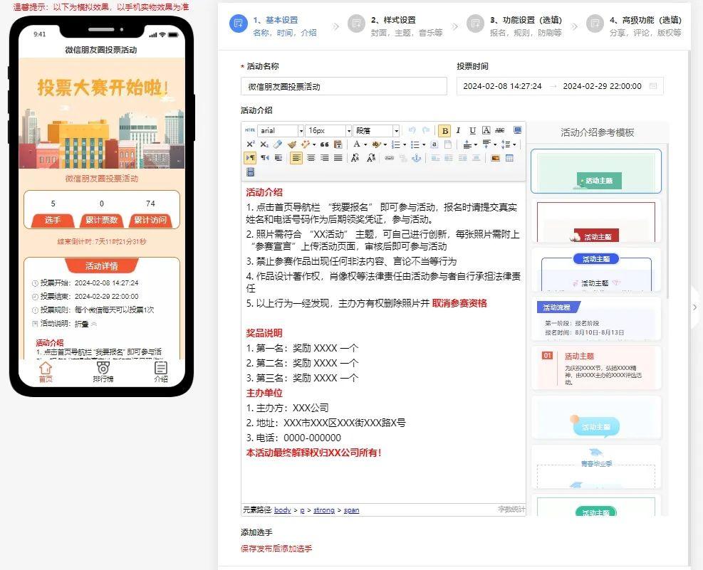确定活动主题后,按照需求输入活动名称,内容介绍以及起止时间。