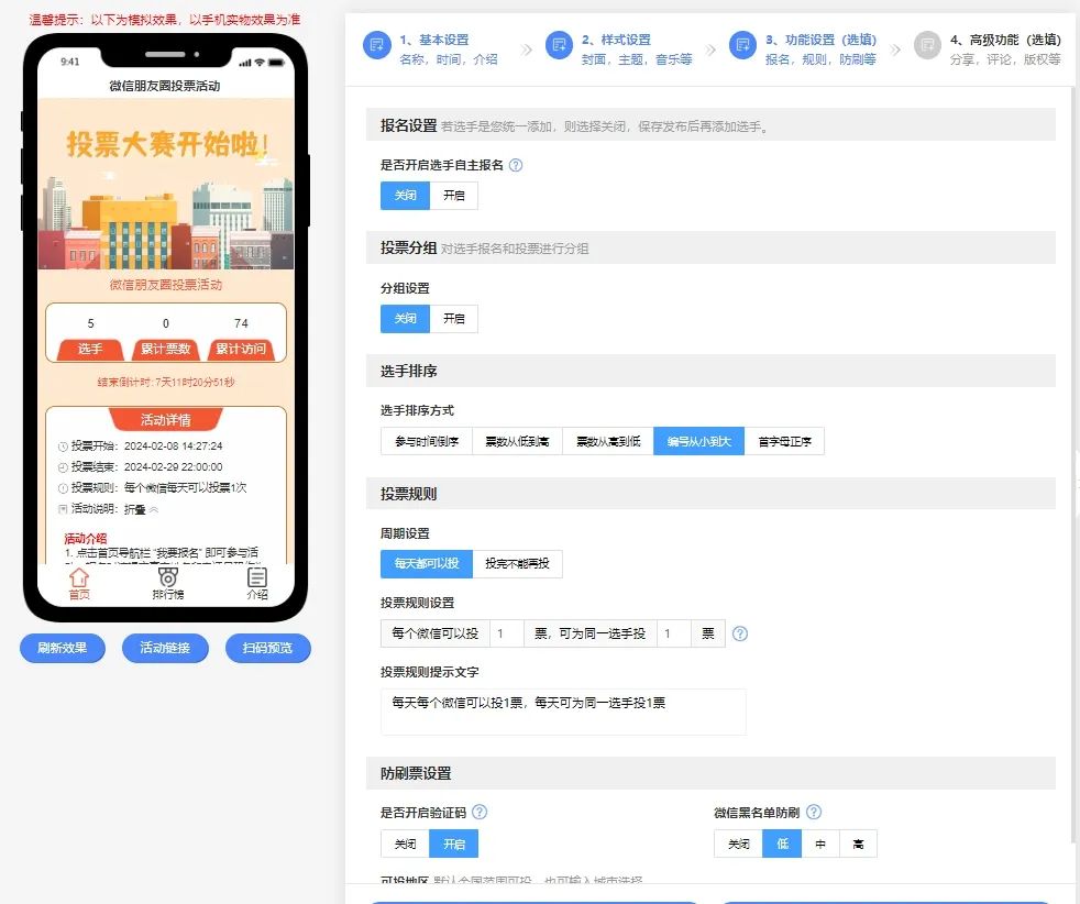 设置投票分组、投票规则,选手报名(可开启选手自主报名或由主办方统一上传),还可开启防刷票功能,保障活动的公平性。