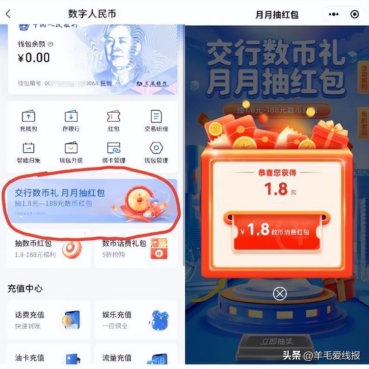 亲测1.8红包,交行月月抽数币红包,保底1.8元