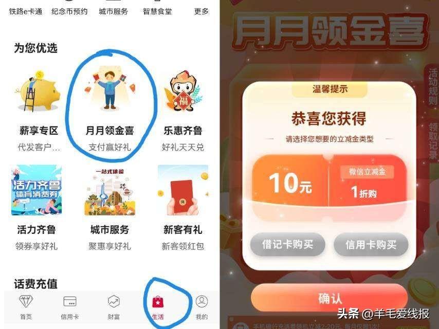 中国银行App - 生活 - 找到【月月领金喜】,抽折扣购立减金!保底3元,村长亲测抽到10元立减金。(此线报仅限山东中行用户参与!青岛除外)