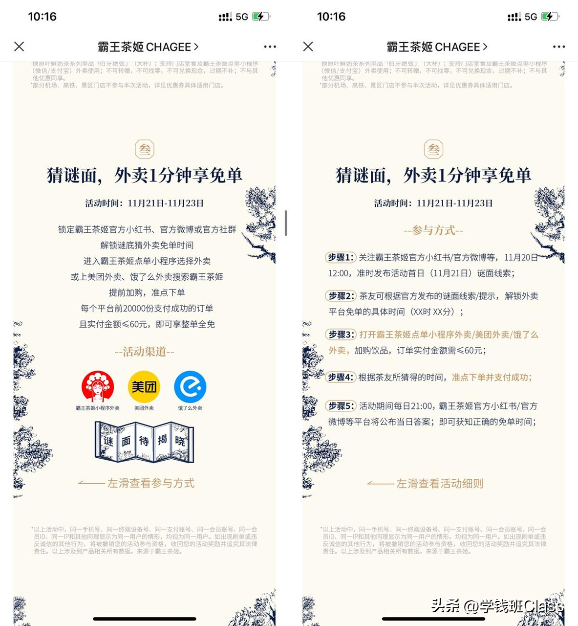 每天根据小红书 或 微博线索猜免单时间,在该时间的1分钟内在小程序/美团/饿了么下単,每个平台前2万名即可免单。