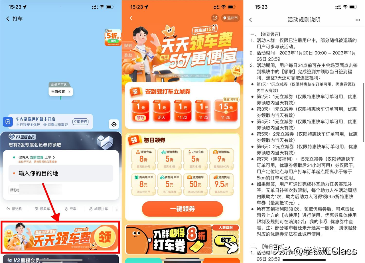 滴滴出行APP或小程序->横幅“天天领车费”->连续签到7天领15元打车立减券