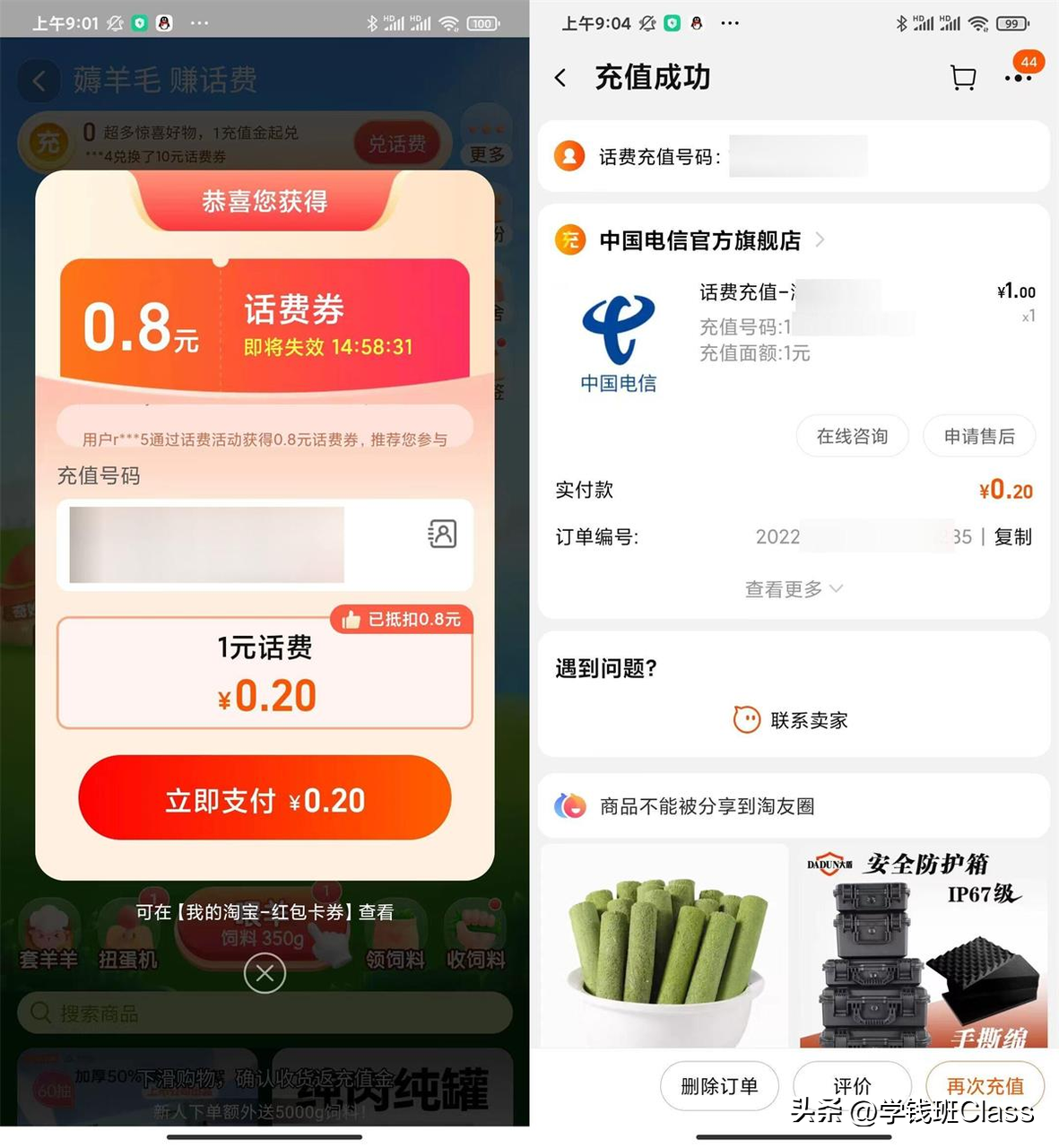 淘宝进入->自动弹出0.8亓话费券->联通或电信可0.2充1亓话费。