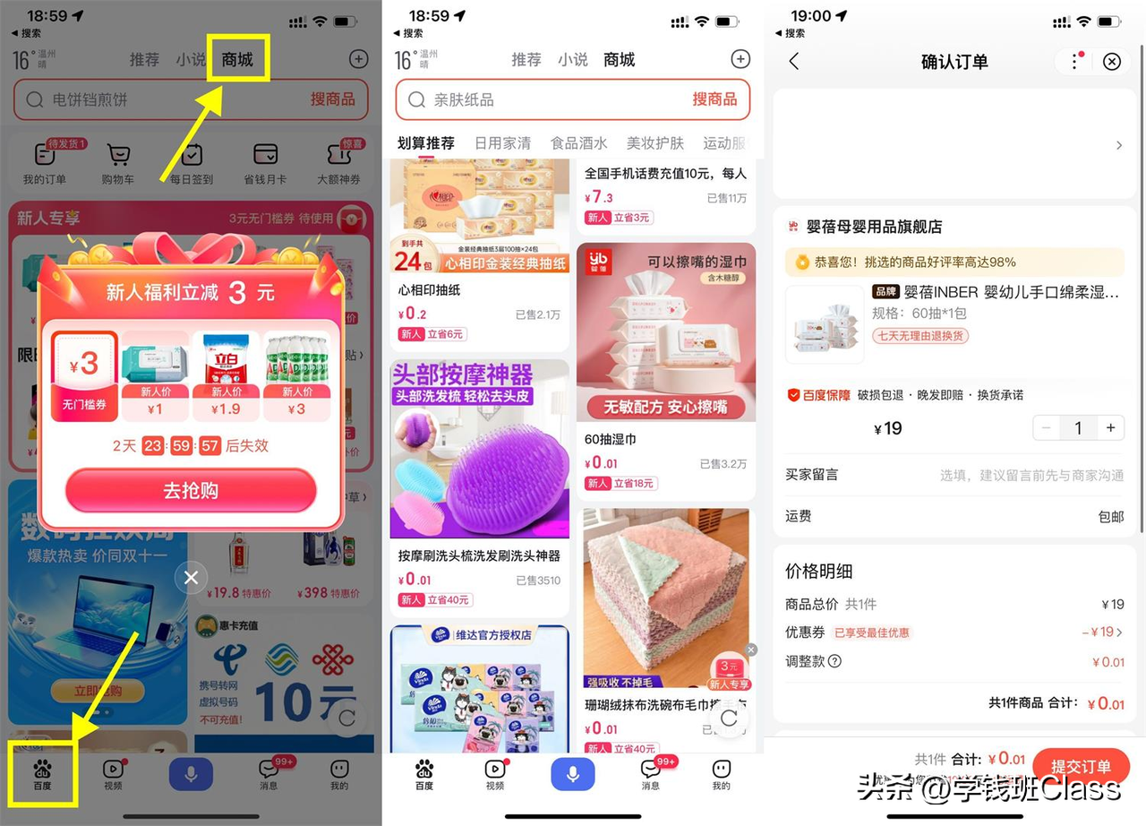 百度客户端最新版->首页顶部“商城”->自动弹出3元券->下拉有挺多0.01亓包邮的实物