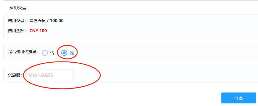 4、填写申请表后进入【缴费环节】点击使用优惠码,输入免费码点击付款即完成注册。