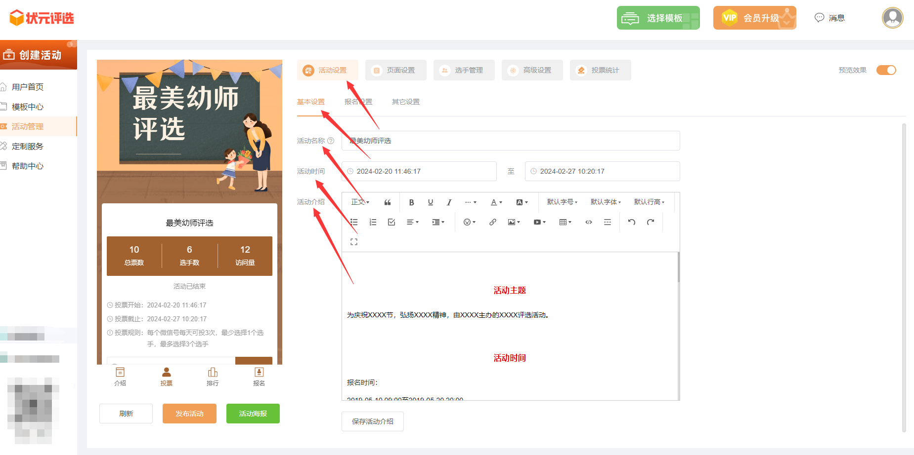 第二步,在【活动设置】里面,按照上面的提示,依次完成将活动名称改成最美幼师评选、设置活动开始和结束的时间、编辑活动介绍内容。