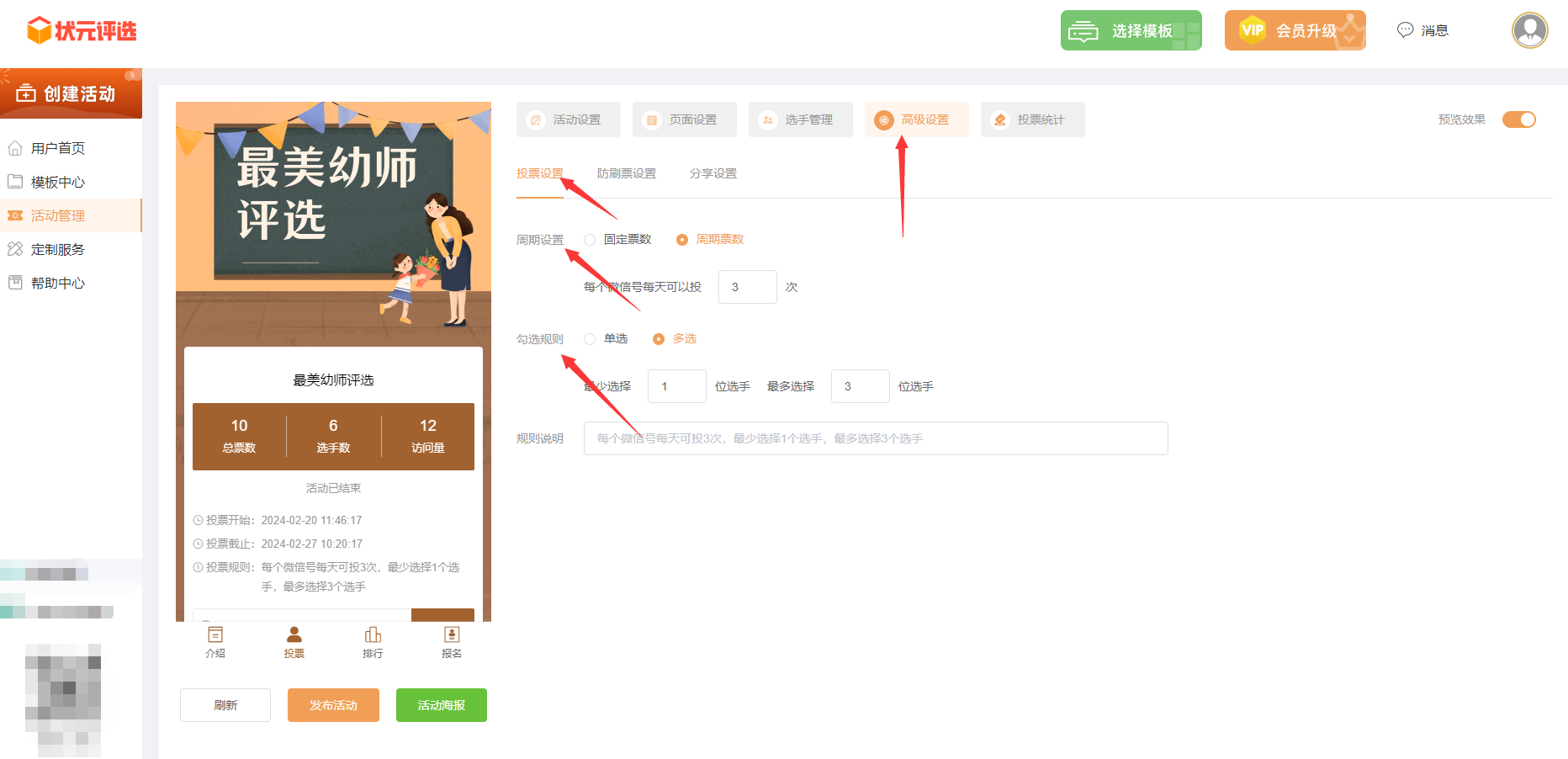 第五步,在【高级设置】里面,设置这一次投票活动的规则,即每个微信号可以给几名选手投票、一次可以投几票等。