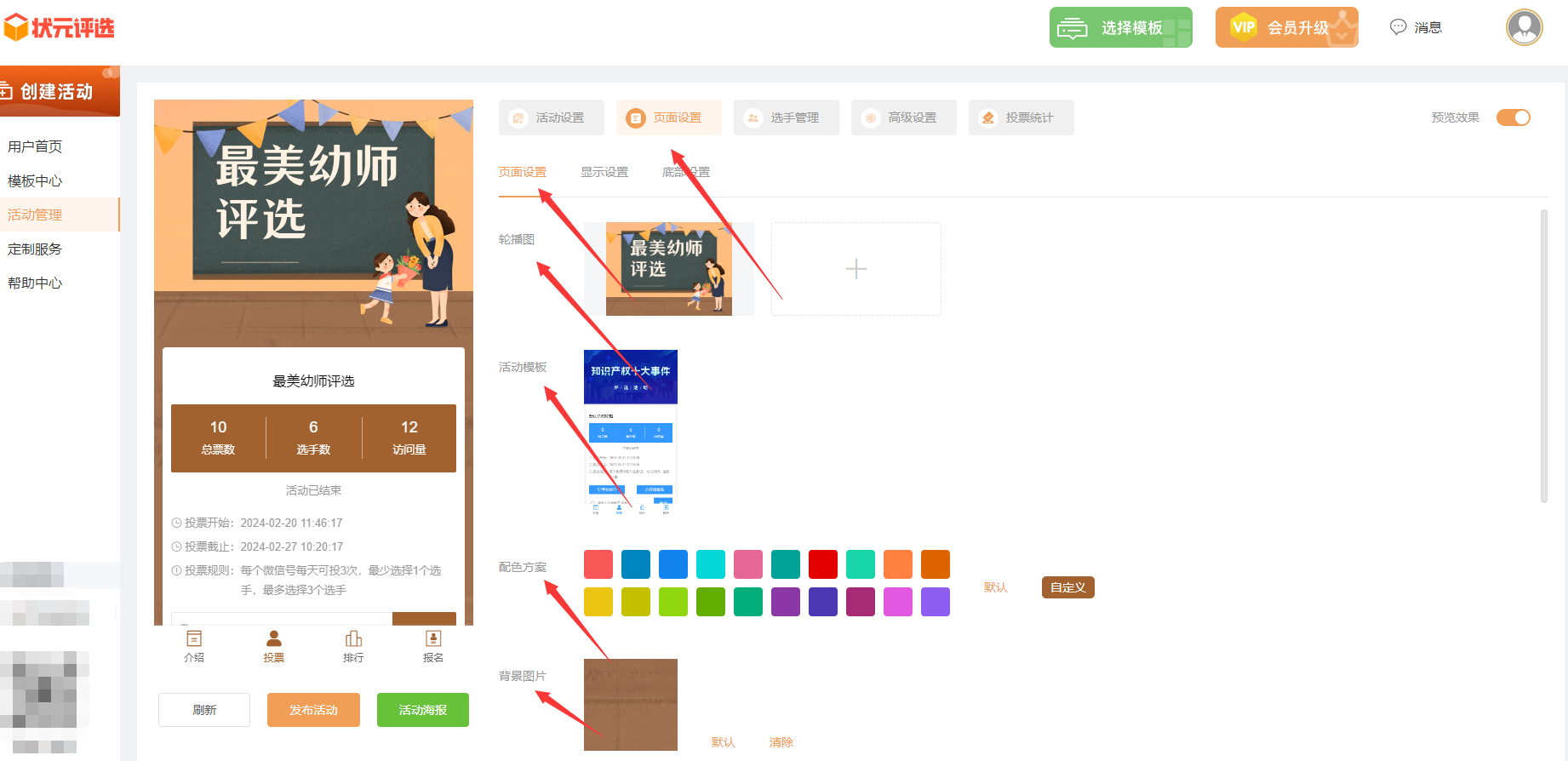 第三步,在【页面设置】里面,更换一张活动轮播图,注意轮播图要与活动主题最美幼师有关还要有一定的吸引力,并根据轮播图的颜色调整配色方案、背景图片等。