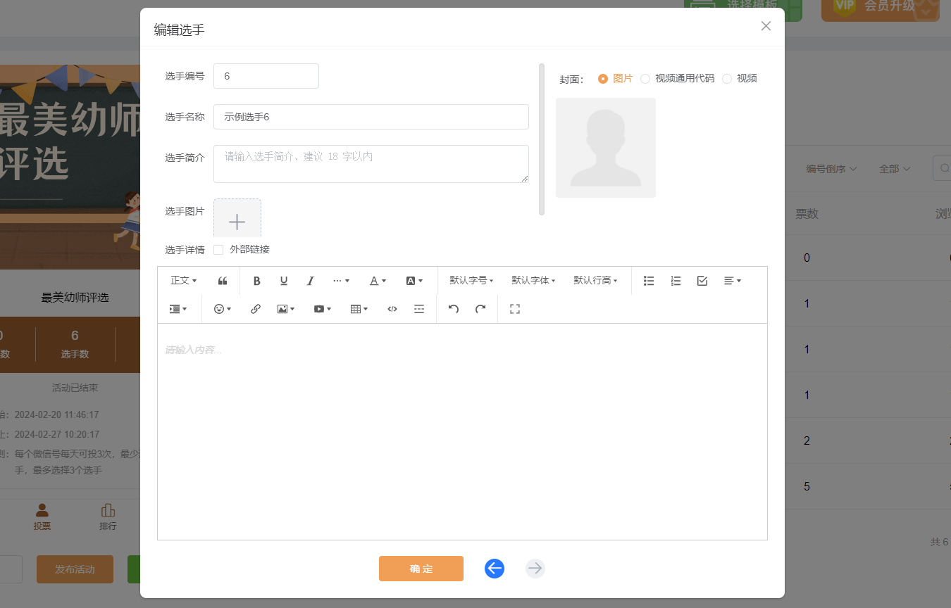 第四步,在【选手管理】中,上传所有参与这次评选的幼师们的资料,包括他们名称、简介、照片等。