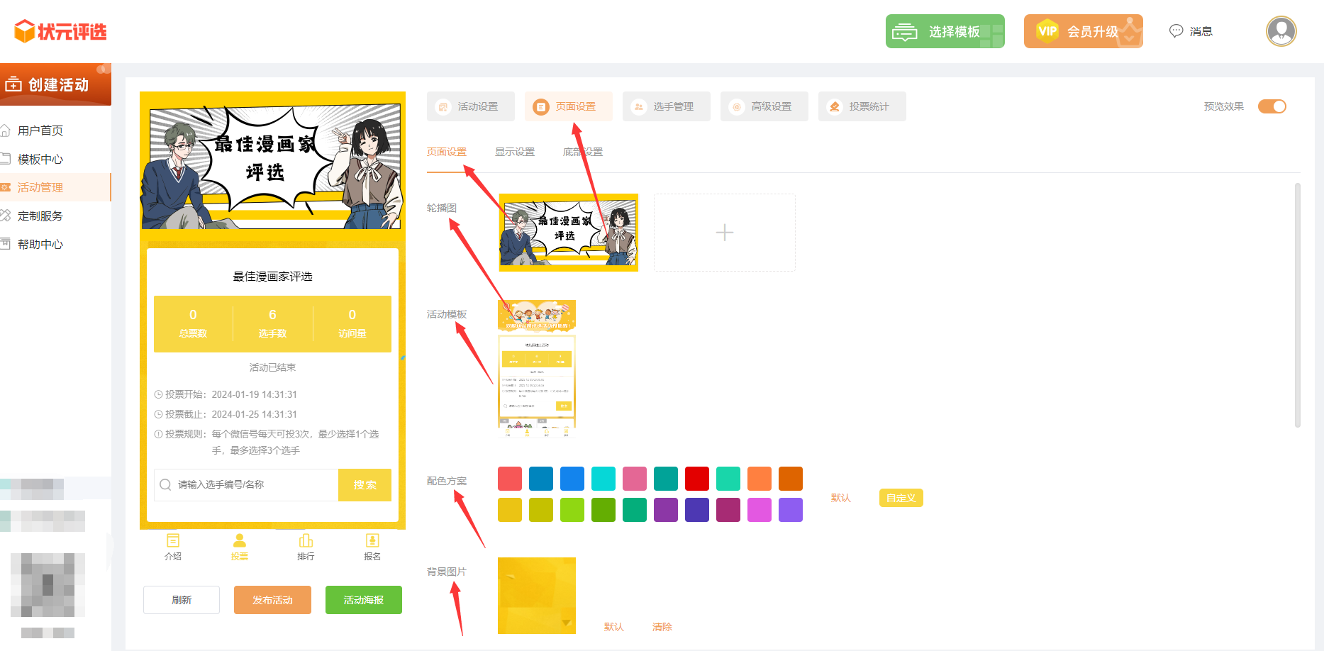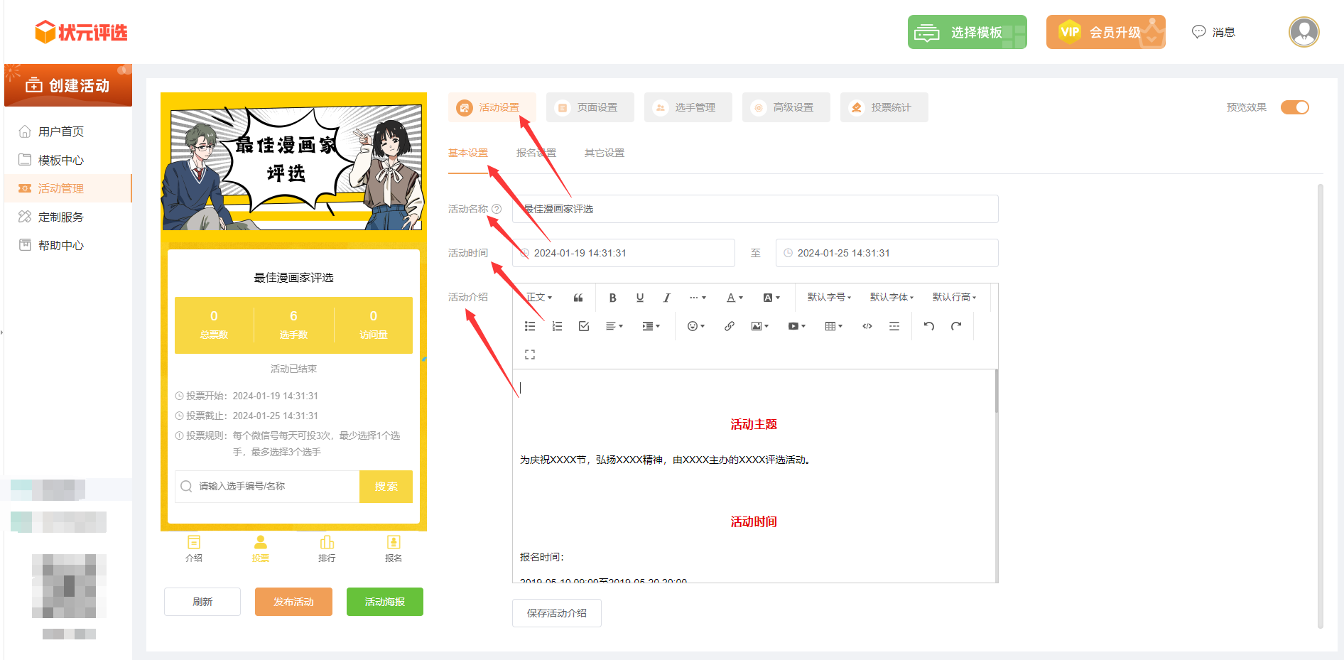 第三步,在【活动设置】里面,将活动名称改成最佳漫画家评选,并设置投票时间以及编辑活动介绍内容。