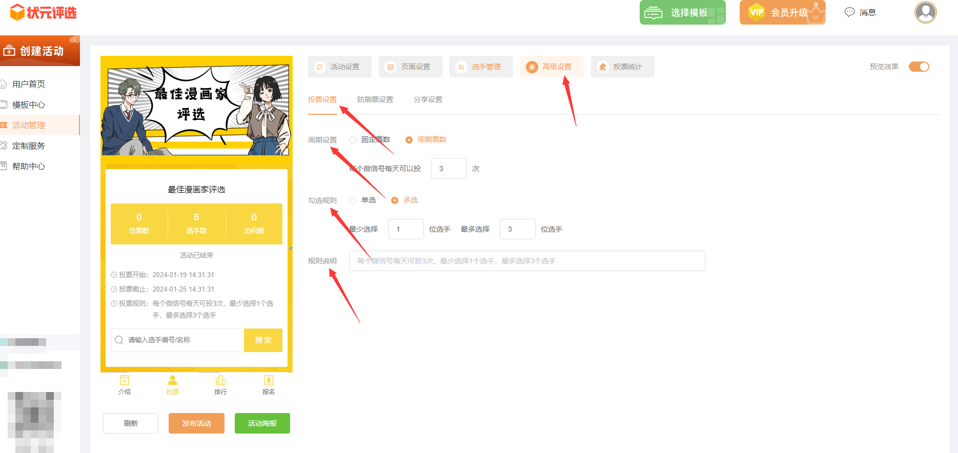 第六步,在【高级设置】里面,设置投票活动的规则,即每个微信号每天可以投几票、可以给几名选手投票等。