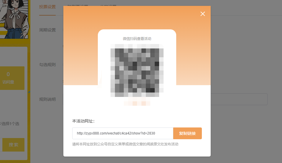 第七步,点击【发布活动】,系统就能自动生成活动的链接和二维码。这样最佳漫画家微信投票活动就已经制作完成了,是不是很简单?
