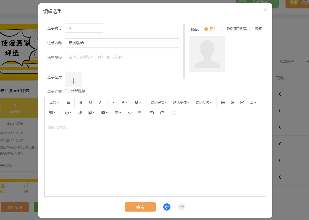 第五步,在【选手管理】中,上传所有选手的资料,包括他们的名称、简介等内容。