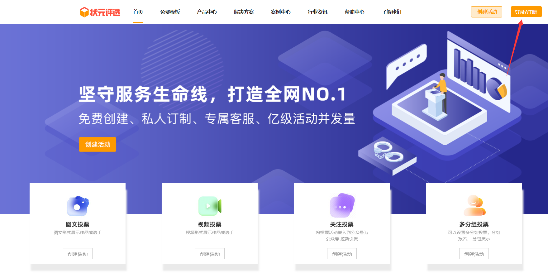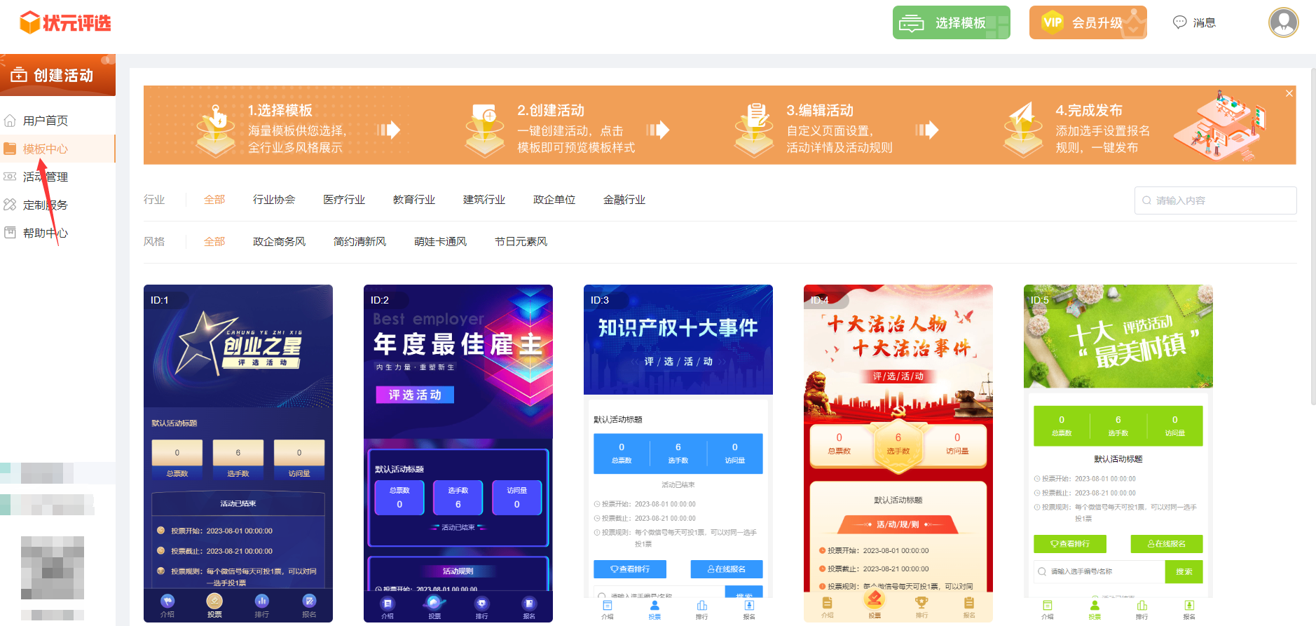 第二步,注册成功之后,系统会自动跳转至活动后台,在后台的【模板中心】里面,我们可以根据自己的喜好或者活动主题,来选择一个合适的模板样式,如知识产权十大事件、创业之星等模板。