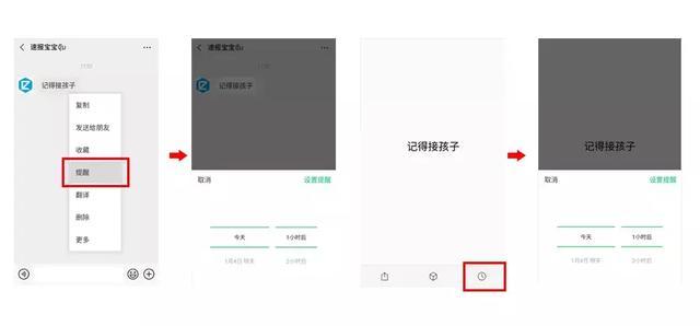 微信里还能给消息设置时间提醒。长按需要提醒的消息选择「提醒」,或者双击需要提醒的消息,然后选择想要提醒的时间,So easy。妈妈再也不用担心我忘记重要的消息了。