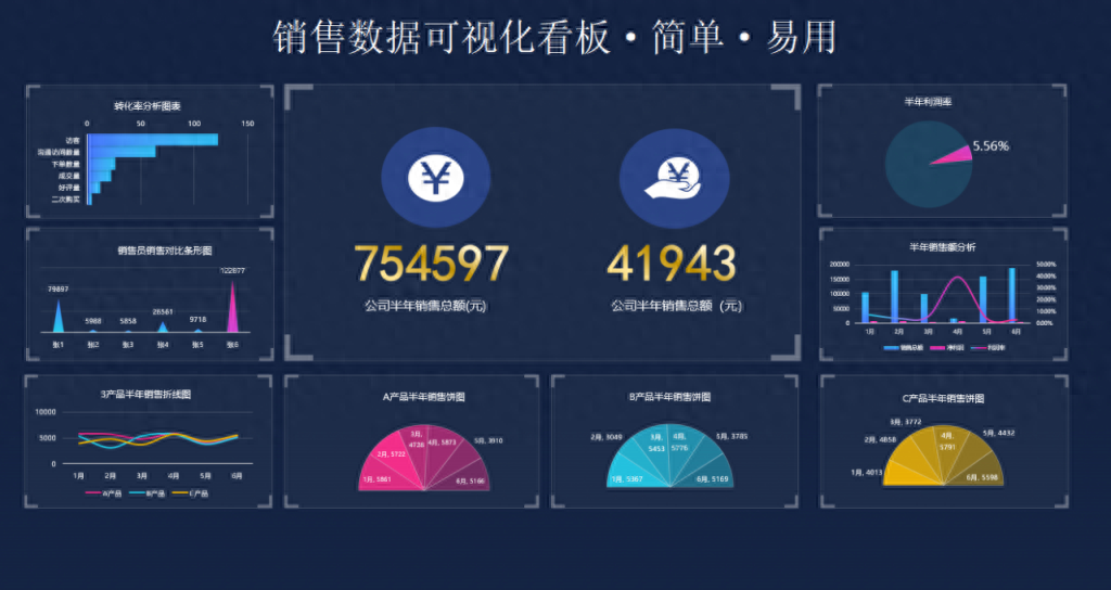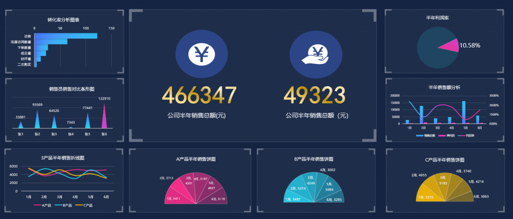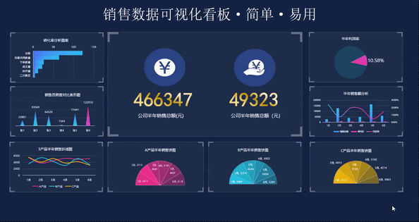首先看到的这张图,这就是咱们要做的销售数据可视化看板的样子,各个图表之间还能联动,动态显示数据。