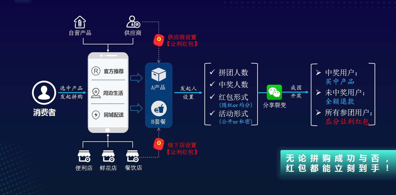 其他用户看到拼购活动后,可以选择加入拼团。在拼团期间,用户可以邀请亲朋好友一起参与,增加中奖的概率。当达到设定的参团人数后,系统会自动进行开奖。中奖的用户可以获得商品,而未中奖的用户则可以获得全额退款,并与其他参团用户一起瓜分该拼购活动的让利红包。
