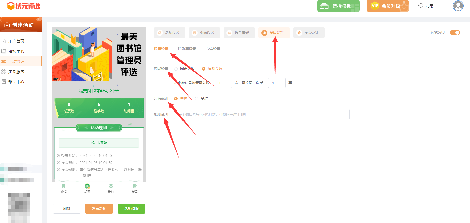 第六步,在【高级设置】这一页面,设置投票活动的规则,即每个微信号在活动期间可以给几名选手投票、投几票等。