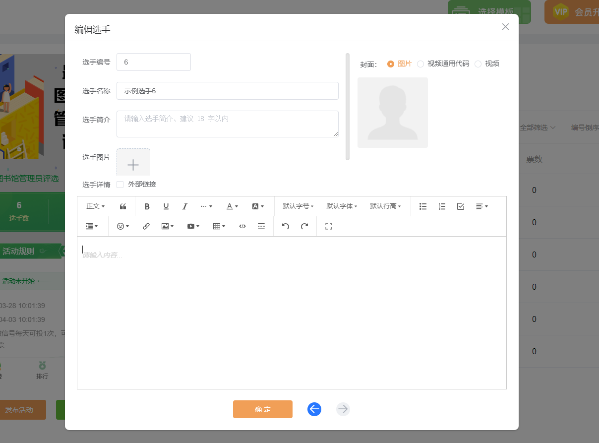 第五步,在【选手管理】里面,上传所有参与这次评选的图书馆管理员的资料,包括他们的名称、简介、照片等。