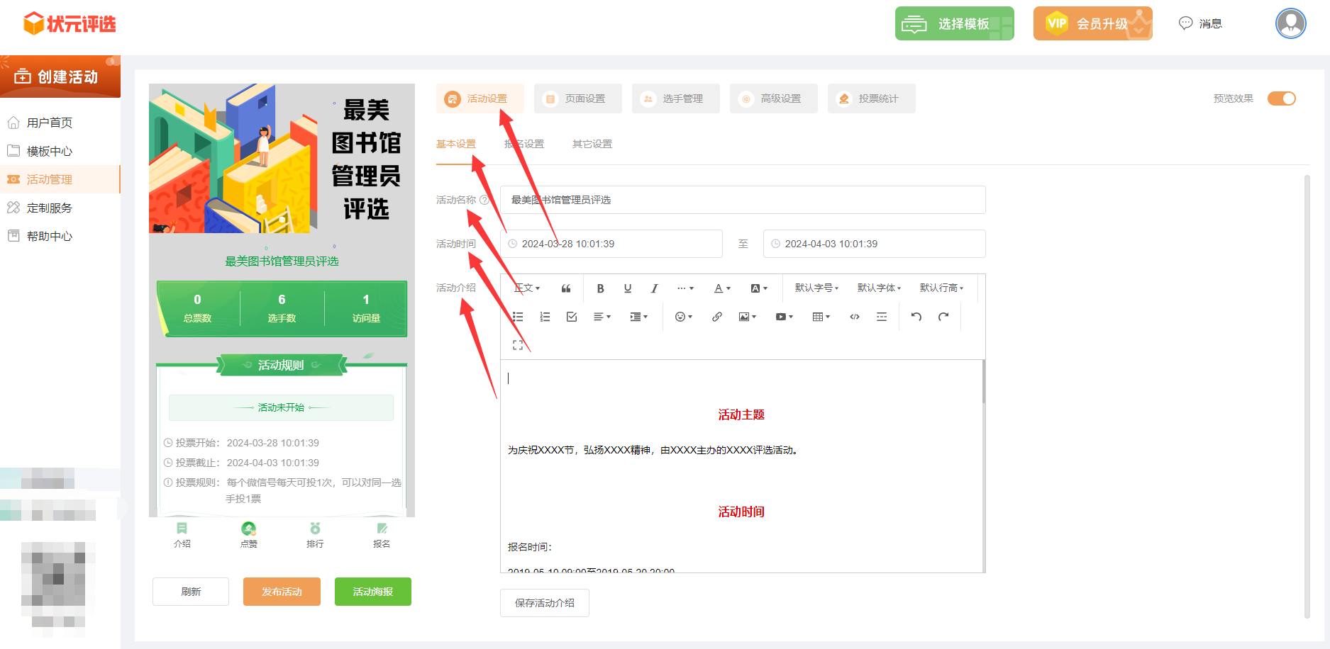 第三步,在【活动设置】里面,将活动名称改成最美图书馆管理员,并设置活动的时间和编辑活动介绍等。