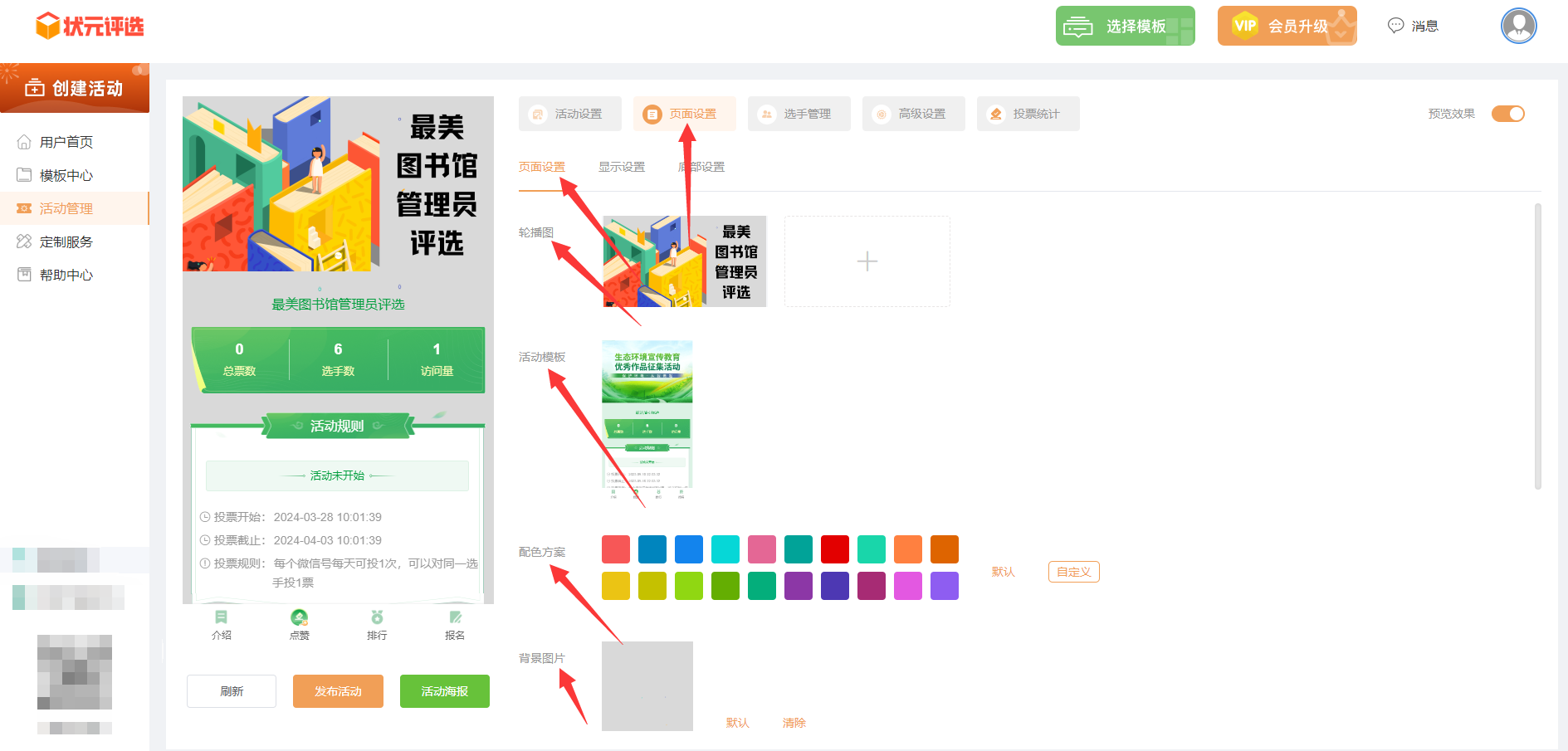 第四步,在【页面设置】中,上传一张能够突出主题最美图书馆管理员的轮播图封面,并根据封面颜色,更换背景图片、调整配色方案等。
