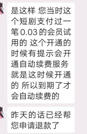 原来,1月底,许先生在短视频平台刷视频时,点进一小程序观看短剧,当时,页面曾跳转出“三分钱尝鲜会员”的选项,“当时想着就三分钱,就随手点了观看。”可他记得,相关界面并未提示过后续还要继续扣费,“要是知道后续扣这么多,我肯定不会付的,况且我后面也没有再看过。”他随即通过QQ号联系了客服,要求退费,客服却称许先生在短剧支付过一笔0.03元的会员试用,开通时有提示过自动续费服务。后来,在许先生的强烈要求下,对方退还了1个月的会员费,但他对此并不满意,“明明没有享受过服务,为什么要我买单?”