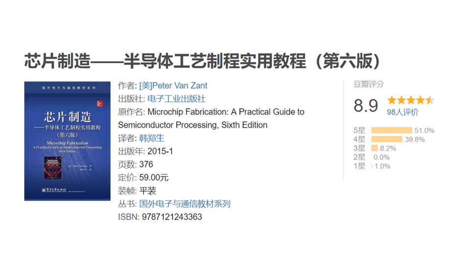 选择了这本《芯片制造——半导体工艺制程实用教程》。豆瓣上评分也挺高,业内评价也很好。