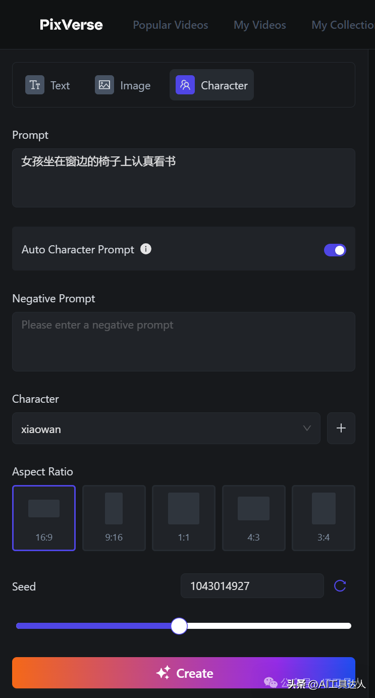 2、生成短视频。点击左上角的Create,进入短视频生成界面。这里我们可以看到有三种创建短视频的功能,分别是文本生成视频、图片生成视频、角色生成视频。进入第三个标签(Character),在这里操作如下: