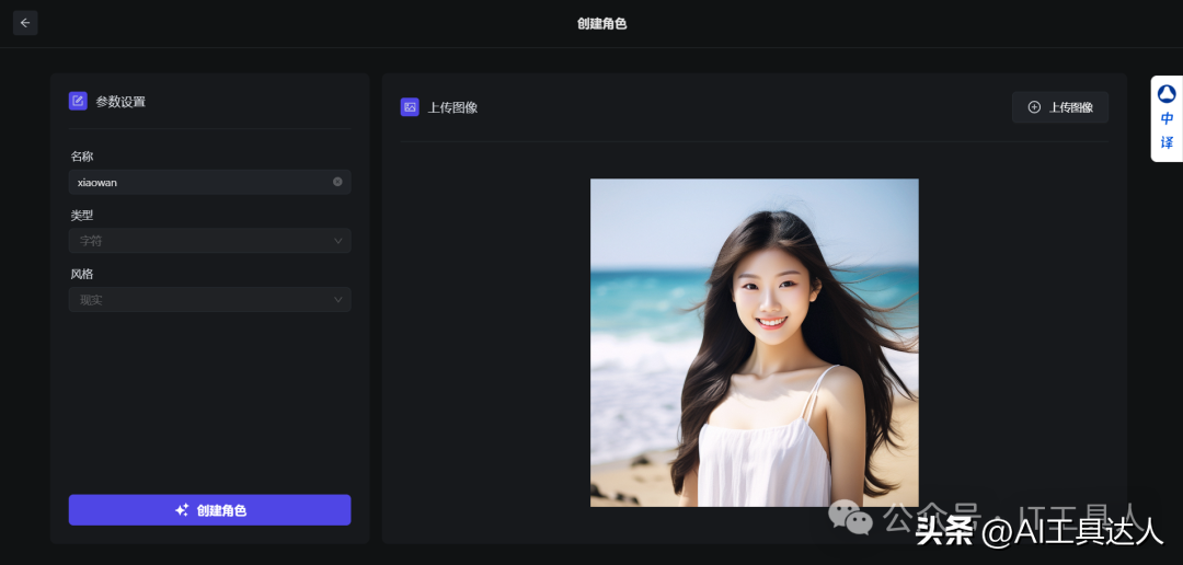 创建角色,然后导入视频的主角图片。页面中有列出图片样本,如果选择的图片脸部较小,将会报错提示脸的大小要超过200X200px。角色可以是真人也可以是动漫人物,我这里用的是AI生成的人物(这个是我的公众号御用人脸了),建议做短视频的创作者们,尽量用AI来生成一个人物,后期做短视频都可以用这个。