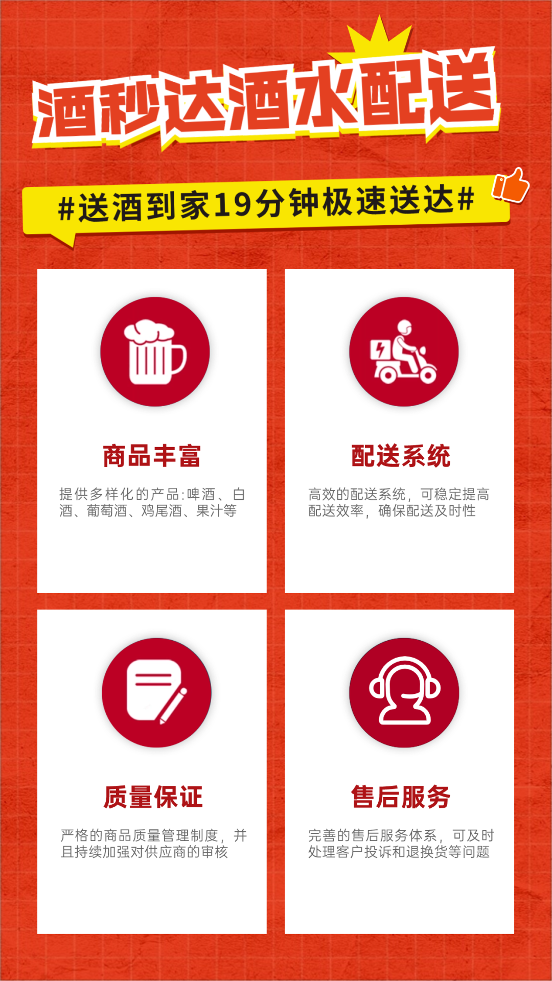 酒秒达通过微信公众号小程序、合作店前置仓、自有配送团队的有效协作,实现同城酒水下单快至19分钟内极速送达,保证时效性。