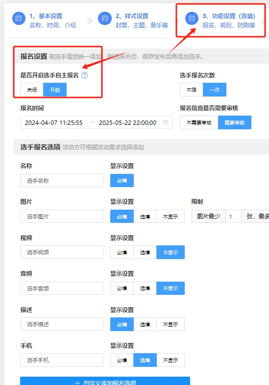 4.如需要选手自主在线报名,可在【功能设置】中开启。