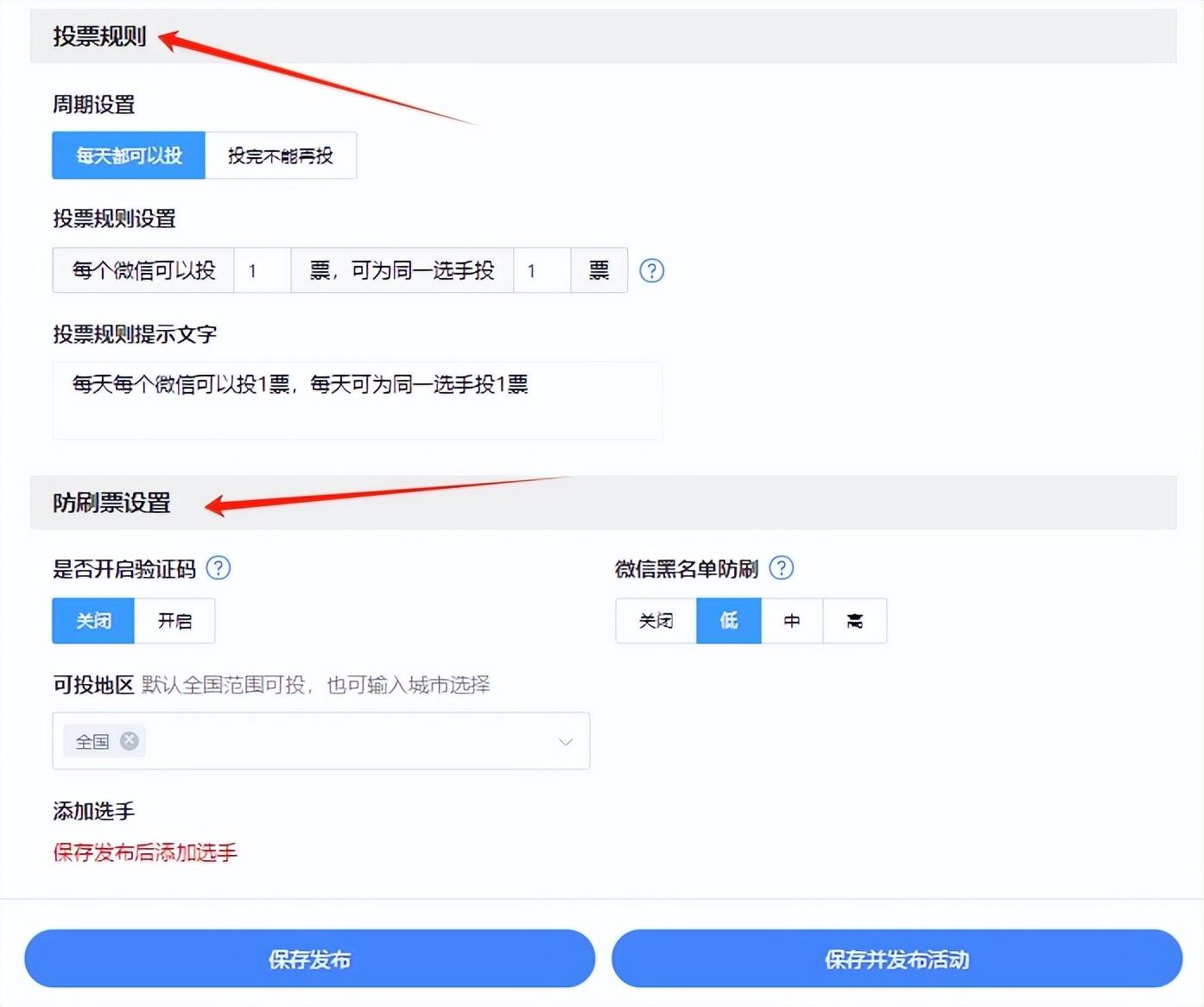 5.设置好投票的规则,如每天每个微信可以投2票,每天可为同一选手投1票,还可设置投票周期(每天都可以投/投完不能再投)。