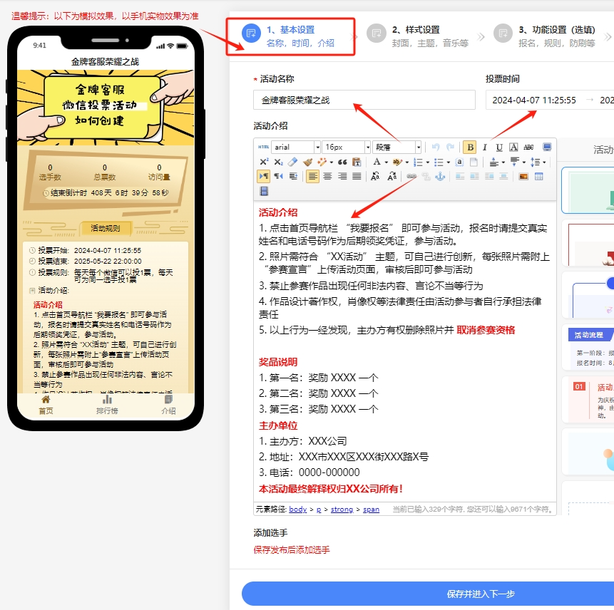 2.输入活动名称(例如:服务先锋大比拼/金牌客服荣耀之战/卓越服务之星评选等)、活动介绍,选择投票时间。