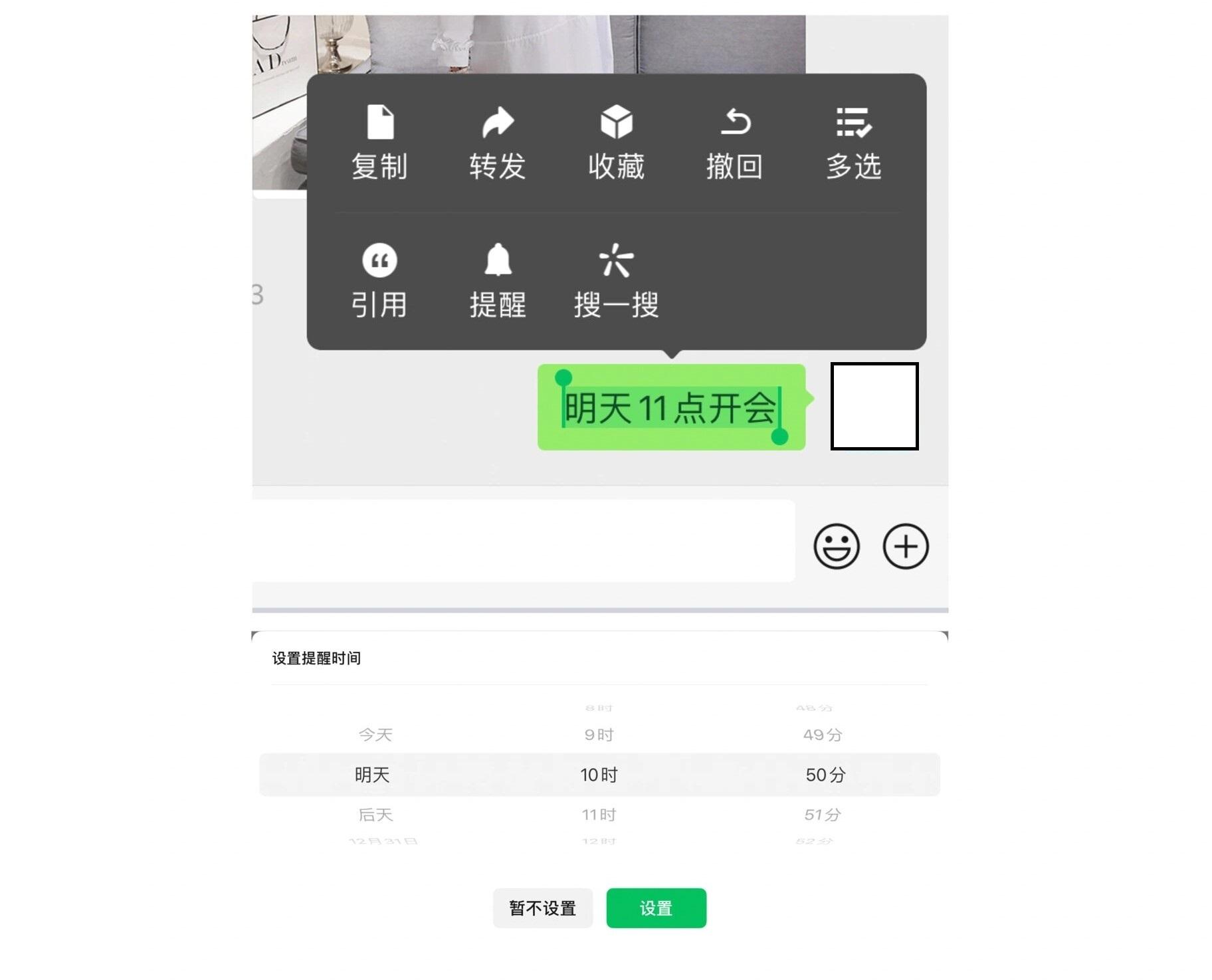 如果有重要的信息,又怕自己会忘掉。你就可以对聊天对话框进行长按操作,会弹出一个菜单,其中就包含了“提醒”功能。