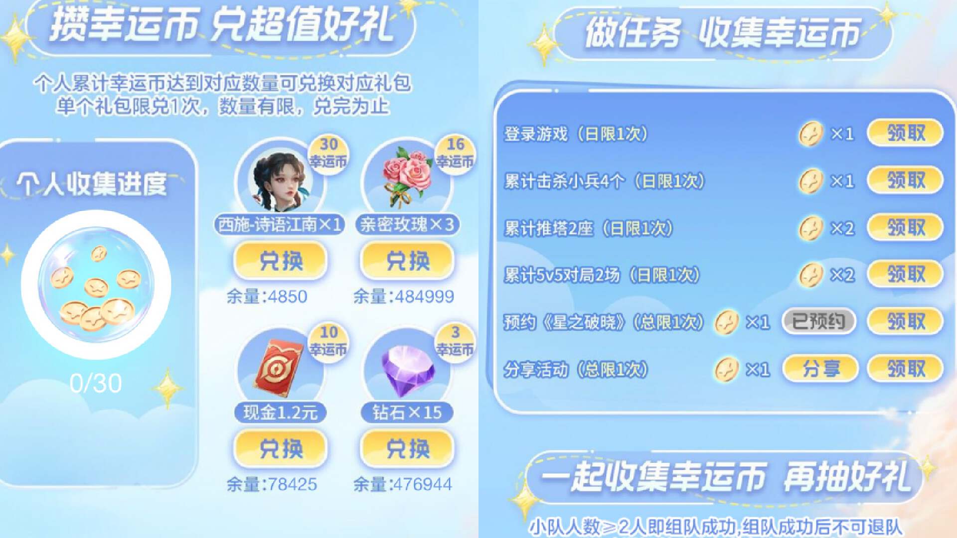 登录游戏,再加上进行对局,一天最多可以获得6个幸运币,然后预约新游戏星之破晓并且分享活动,可以拿到两个幸运币。西施的这款皮肤只需要30幸运币就可以兑换,还是比较容易的。不过需要注意的是,这款皮肤是限量的,所以只有先完成任务集齐30个幸运币的玩家才能够拿到这款皮肤哦。