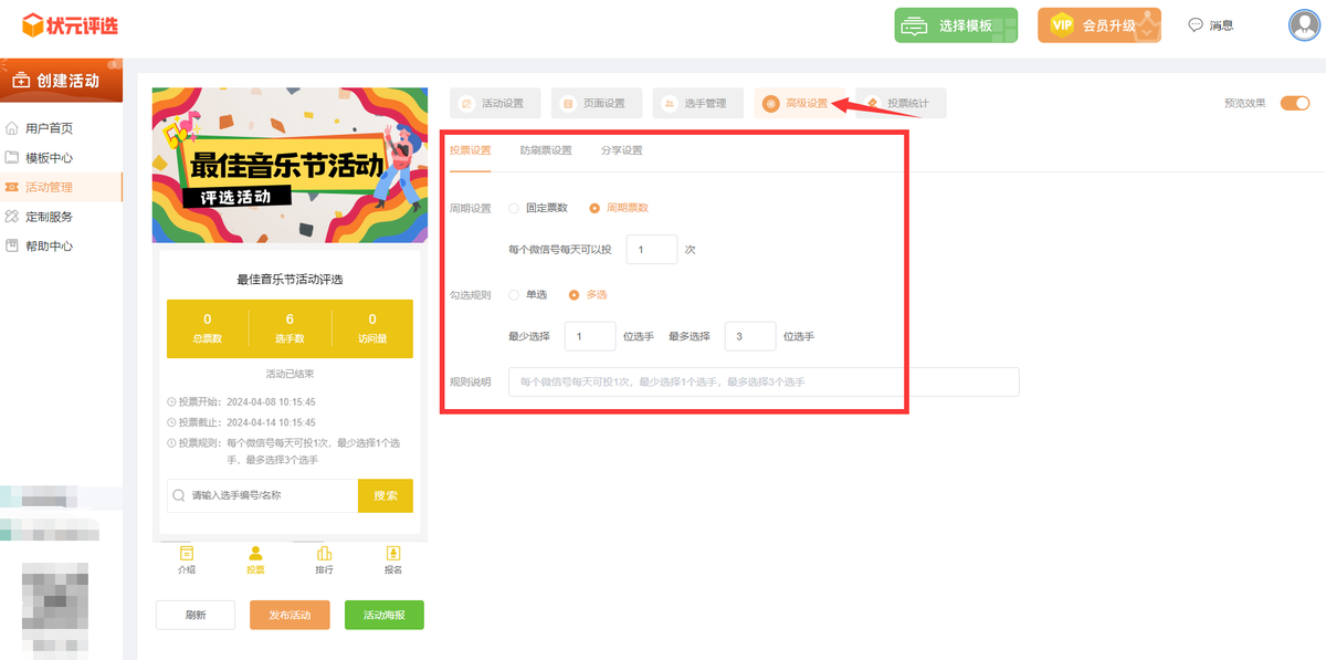 在【高级设置】编辑界面里面,设置此次投票活动的规则,如每人每天可以投票的次数、投票有效期等。