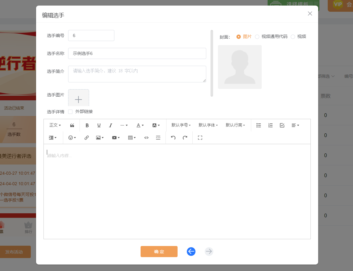 然后,在【选手管理】里面,添加所有参与评选活动选手的资料,包括他们的名称、简介、照片或者视频等。