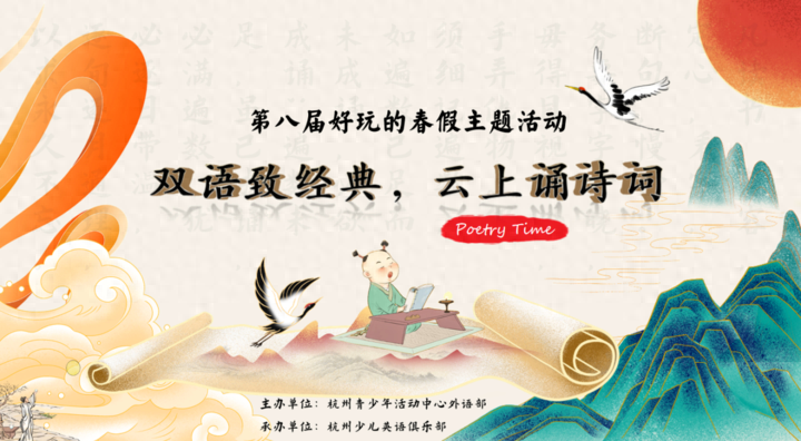 浙江省优秀社团杭州少儿英语俱乐部在春假期间诚邀全市少年儿童利用春假的美好时光,把“读万卷书”与“行万里路”结合起来,以实景拍摄、中英双语的形式围绕五个话题之一录制诗词诵读短视频,努力成为中华文化的传承者和传播者,一起在活动中赏中华诗词、寻文化基因、讲中国故事、交世界朋友,以“领巾飞扬,童声书香”写就为中国式现代化挺膺担当的新篇章。