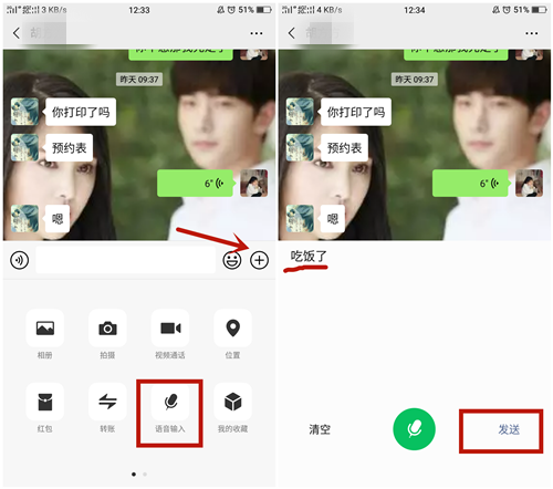 方法:点击聊天框旁边的“+”号键→选择【语音输入】→说出想说的话上滑转文本即可